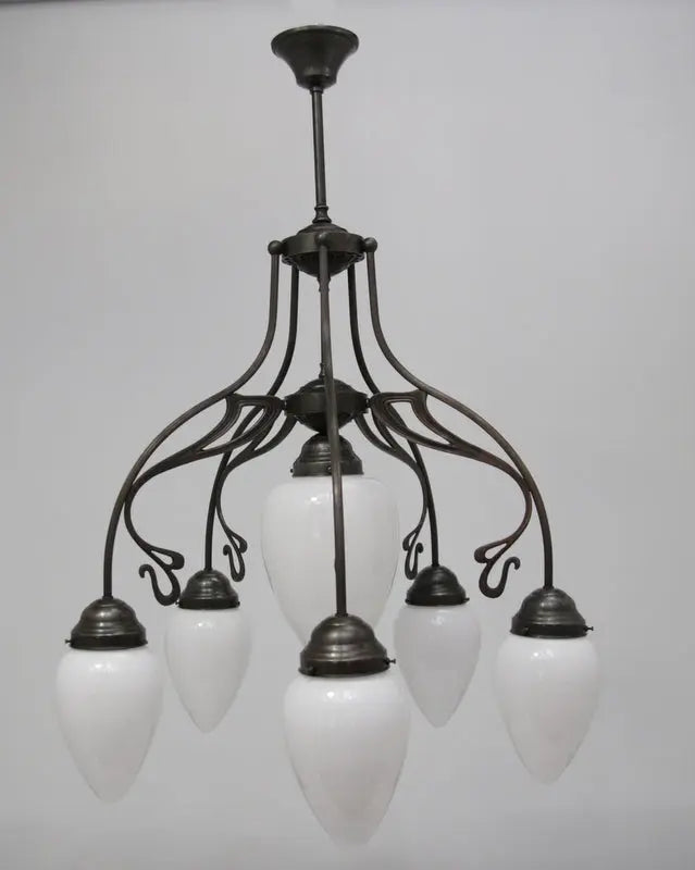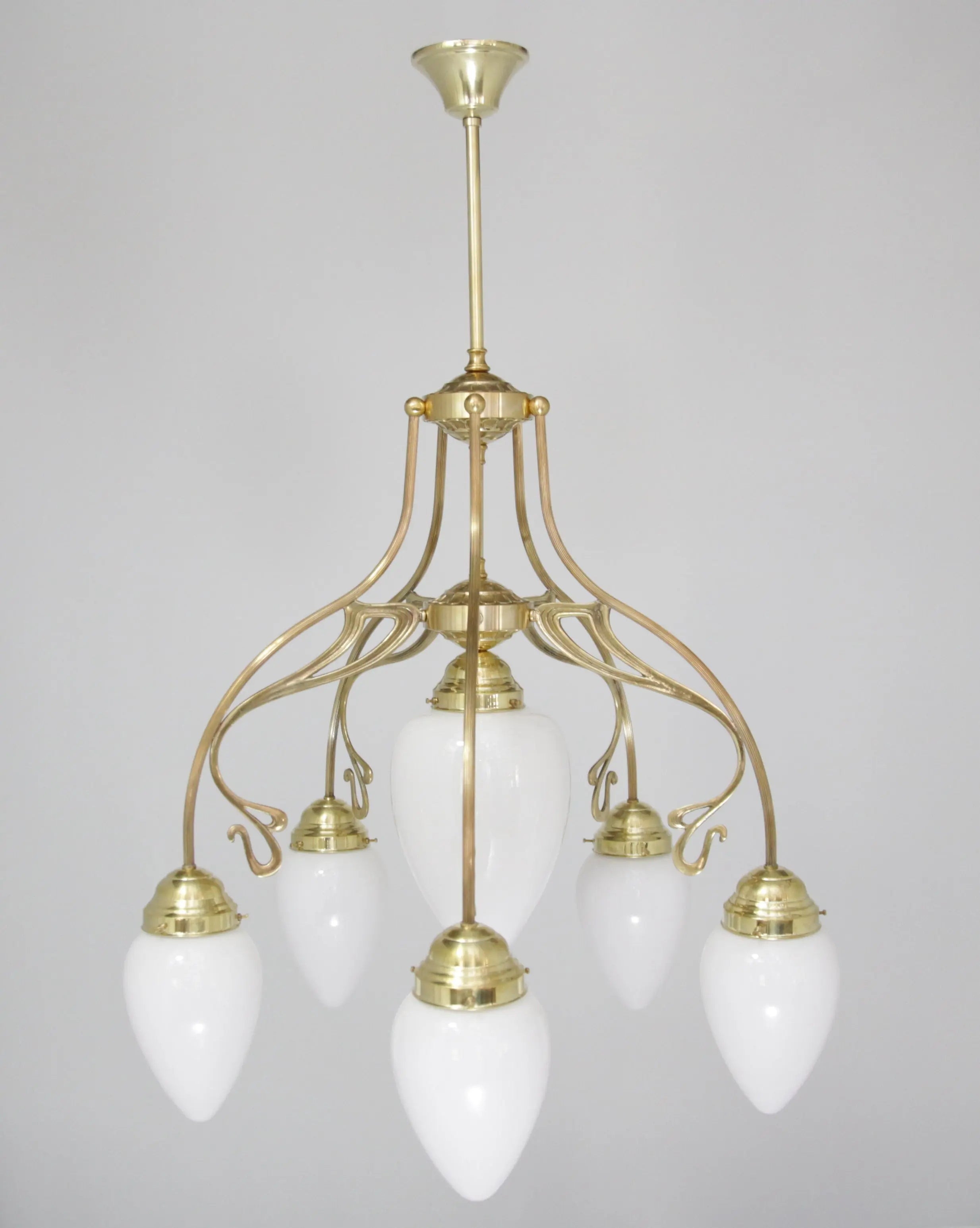 Tauchen Sie Ihr Zuhause in ein nostalgisches Flair mit unserer Jugendstil Hängeleuchte/Deckenleuchte/Kronleuchter, bestehend aus 6 filigranen Armen, erhältlich in Antik- oder Naturmessing. Die opal schimmernden Zapfengläser, elegant gehalten von drei Schrauben am Glashalter, verleihen dieser Leuchte einen zeitlosen Charme.
