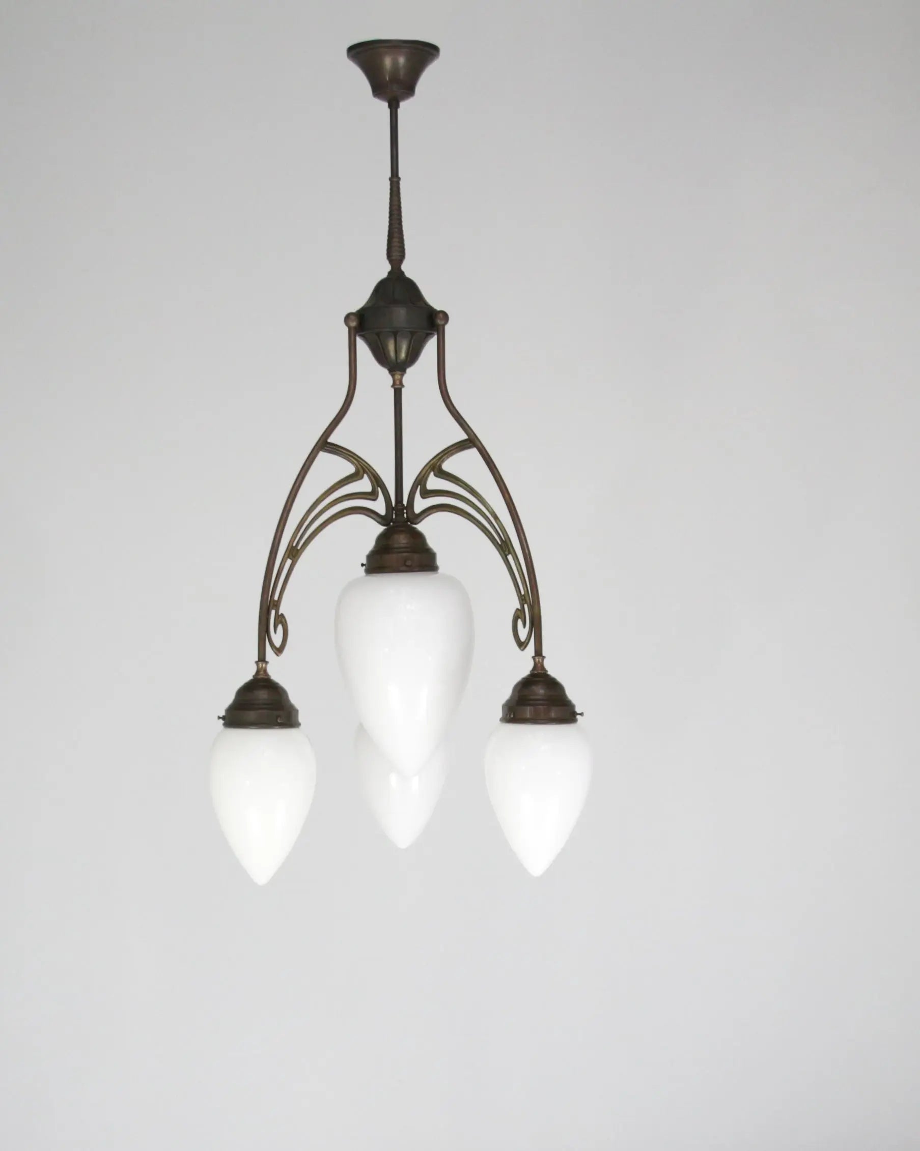 Die Gläser werden sicher von einem Glashalter mit drei Schrauben gehalten, während die Lampenarme kunstvoll mit Jugendstilelementen verziert sind. Diese vielseitige Deckenleuchte ist perfekt für das Wohnzimmer oder den Hausflur geeignet und sorgt überall für eine gemütliche Atmosphäre.