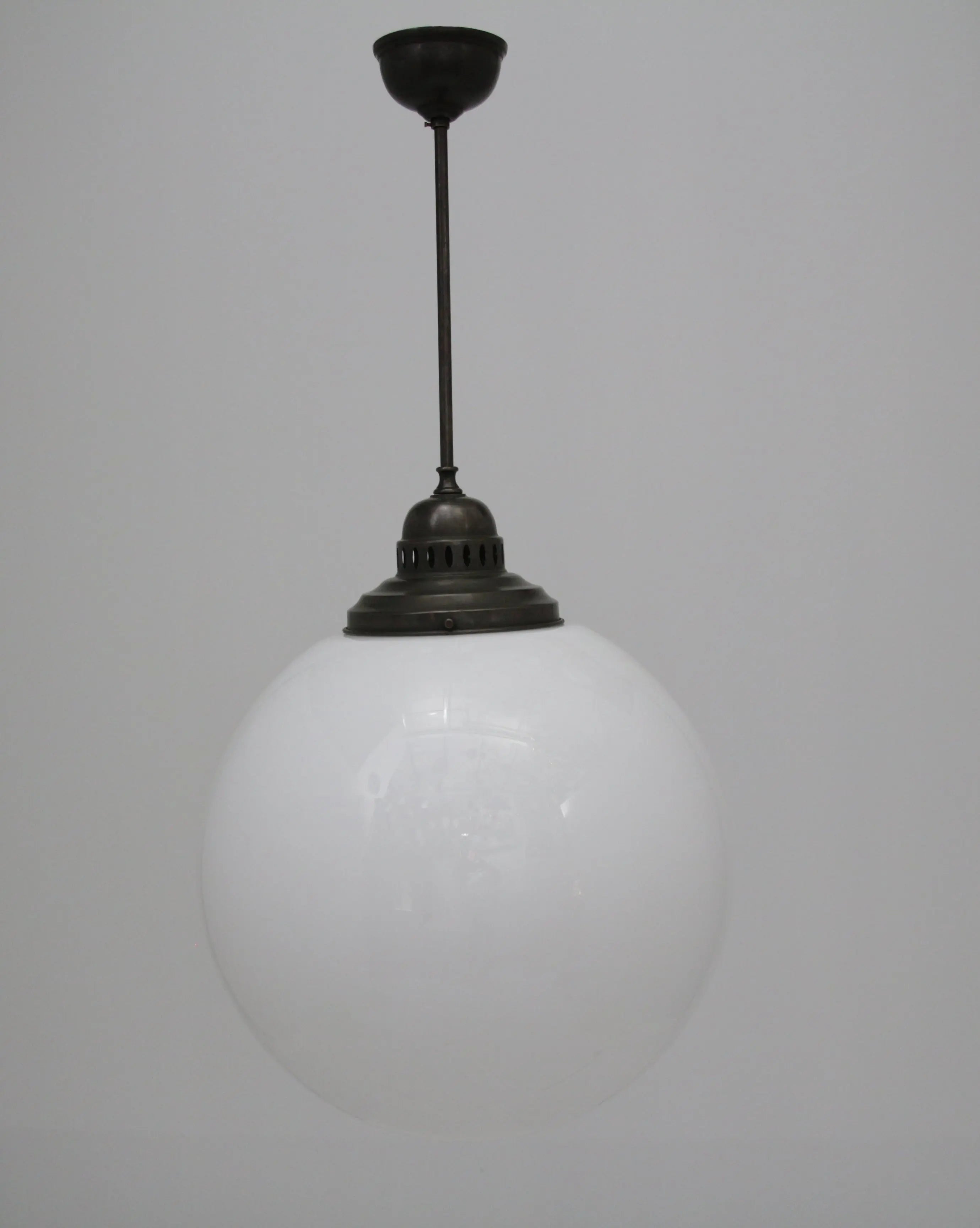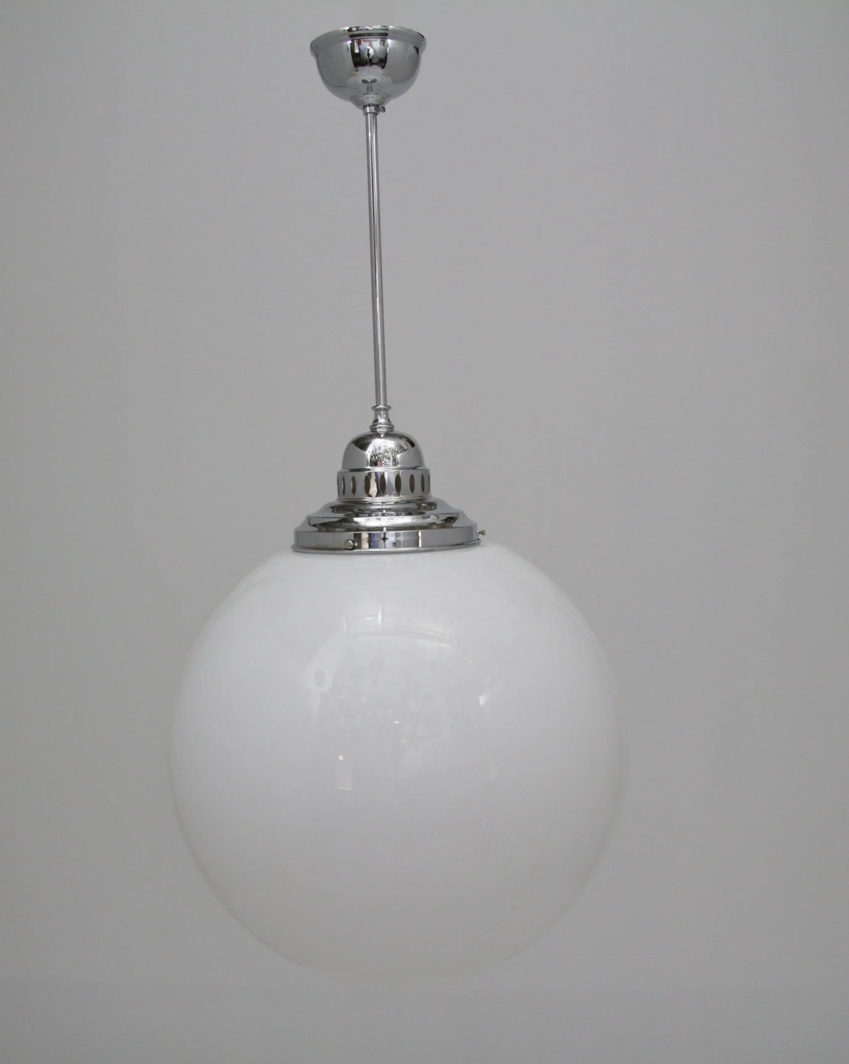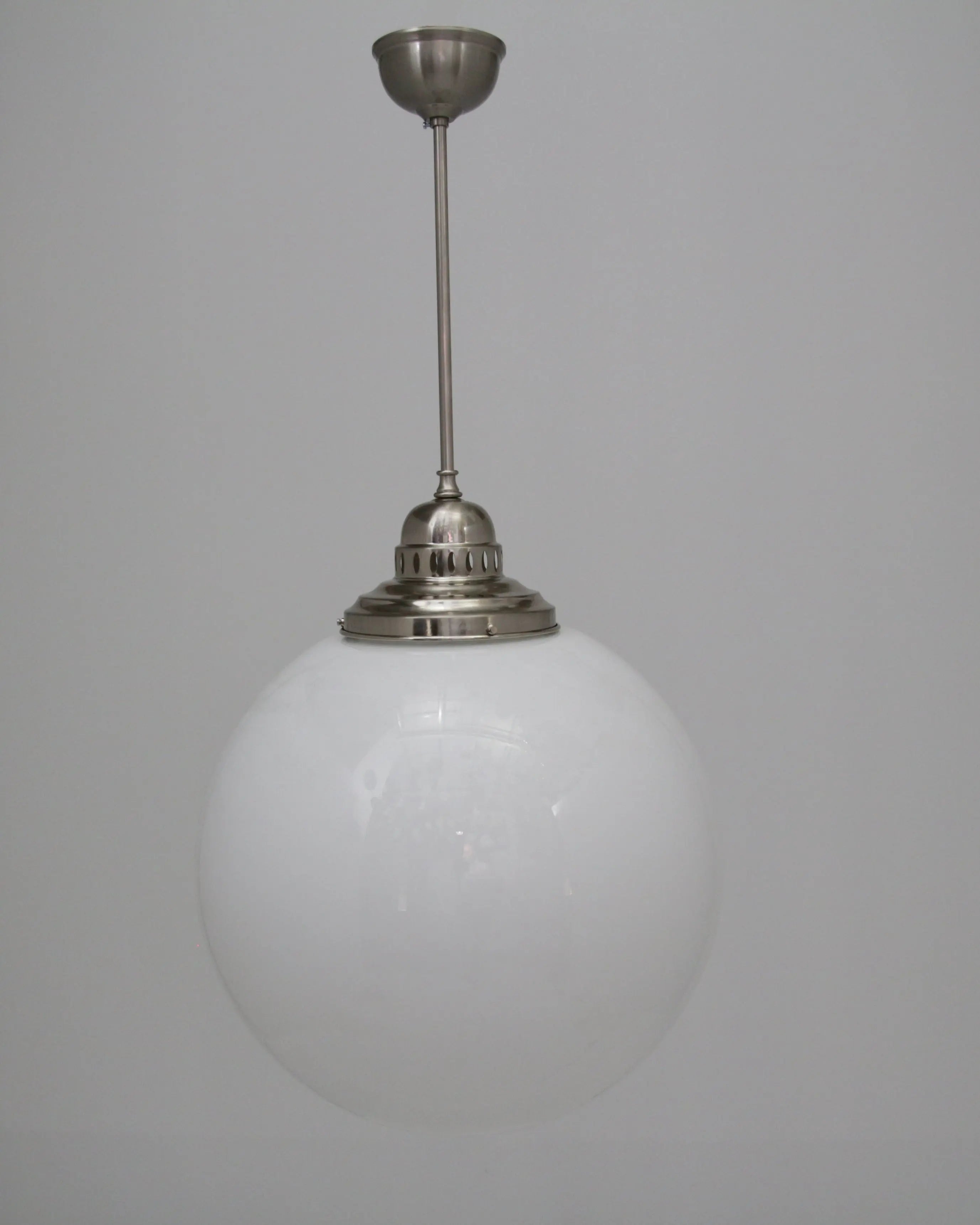Unsere Kugellampe, auch als Deckenleuchte bekannt, verbindet nostalgischen Charme mit zeitloser Eleganz. Gefertigt aus opalem Überfangglas und einer Messingaufhängung in den Legierungen Naturmessing, Antik, Nickel und Chrom, fügt sie sich harmonisch in jedes Interieur ein. Das opale Glas sorgt für eine sanfte Lichtverteilung, die eine angenehme Atmosphäre in jedem Raum schafft.